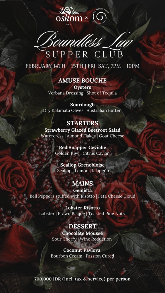 Indulge in a specially curated Valentine’s dinner at Oshom Bali, crafted by the renowned Chef Emigra from Bonjuk Bay. Elevate your evening with a feast that blends exquisite flavors, fresh local ingredients, and culinary artistry, all set in an intimate and romantic atmosphere.